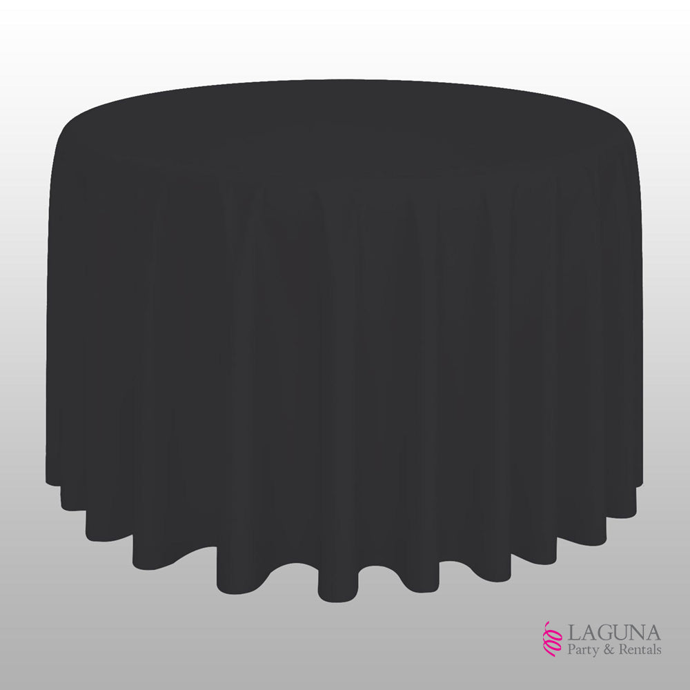 120″ Diameter • Black Color • Umbrella Hole • Polyester • Event setup guide • Linen sizing guide