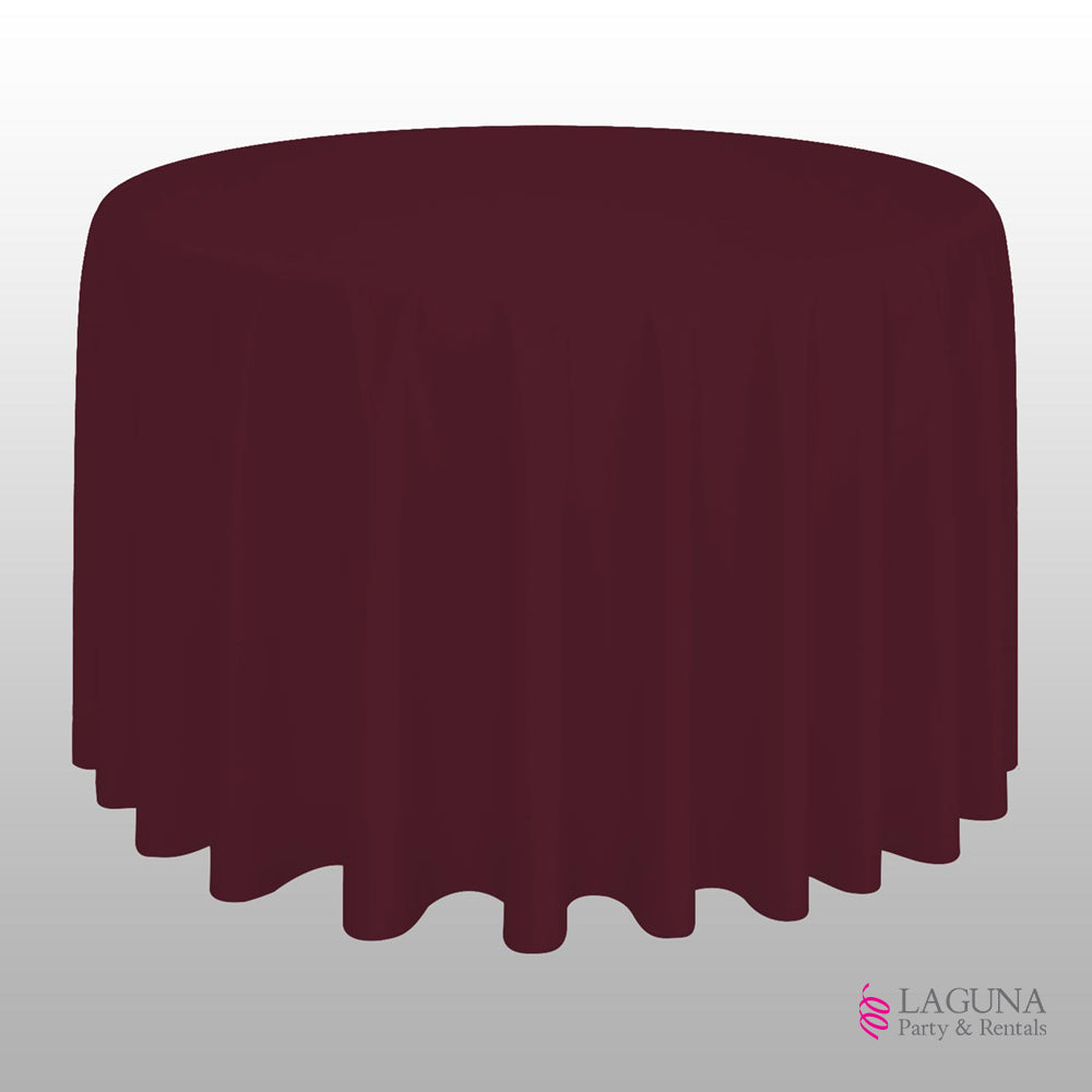 120″ Diameter • Burgundy Color • Polyester • Event setup guide • Linen sizing guide