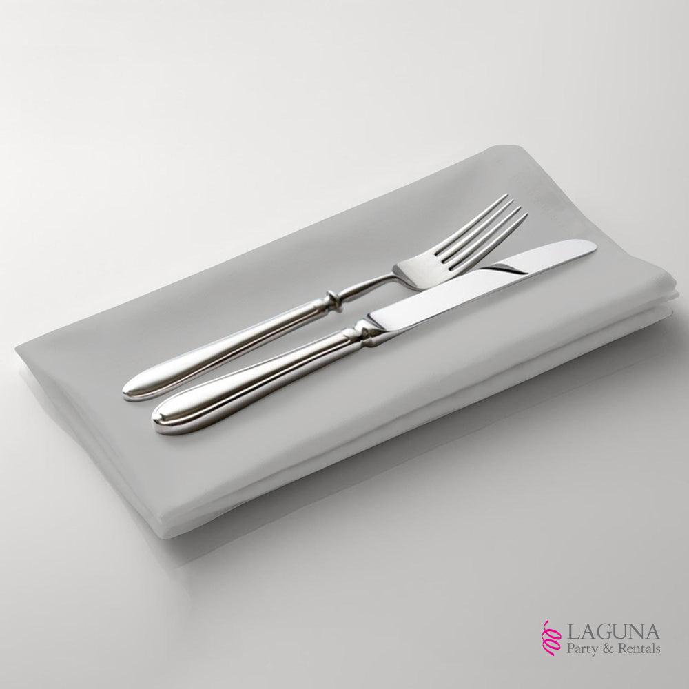 Silver Color • 18″ (W) X 18″ (L) • Rented In Sets Of 10 • Event setup guide • Linen sizing guide