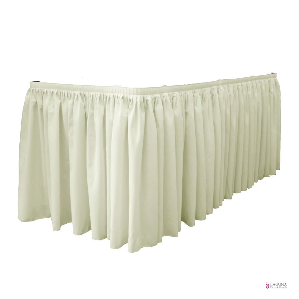 Ivory Color • 13 Ft (L) X 29″ (H) • Polyester • Calculate stage perimeter length and divide by skirt length to determine quantity required