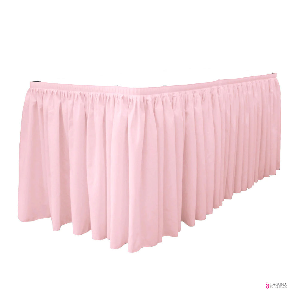 Pink Color • 13 Ft (L) X 29″ (H) • Polyester • Calculate stage perimeter length and divide by skirt length to determine quantity required