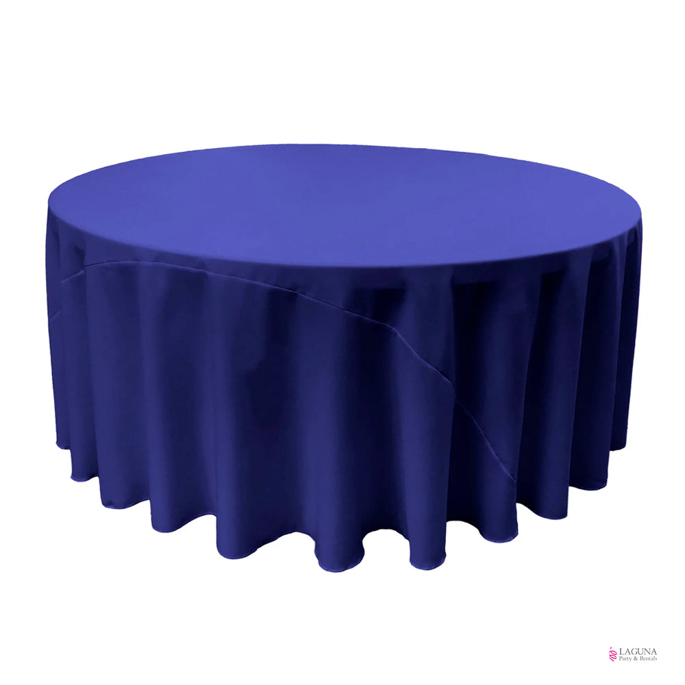 120″ Diameter • Royal Blue Color • Polyester • Event setup guide • Linen sizing guide