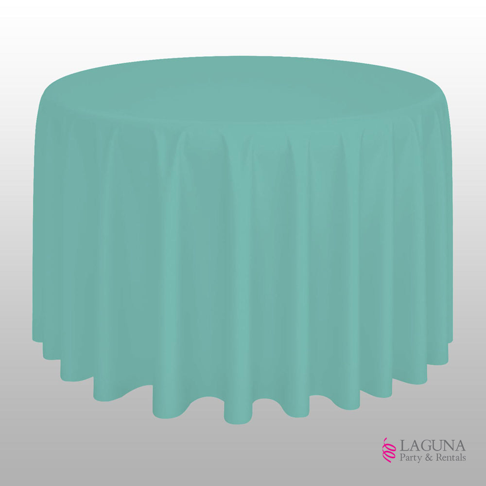 120″ Diameter • Tiffany Blue Color • Polyester • Event setup guide • Linen sizing guide