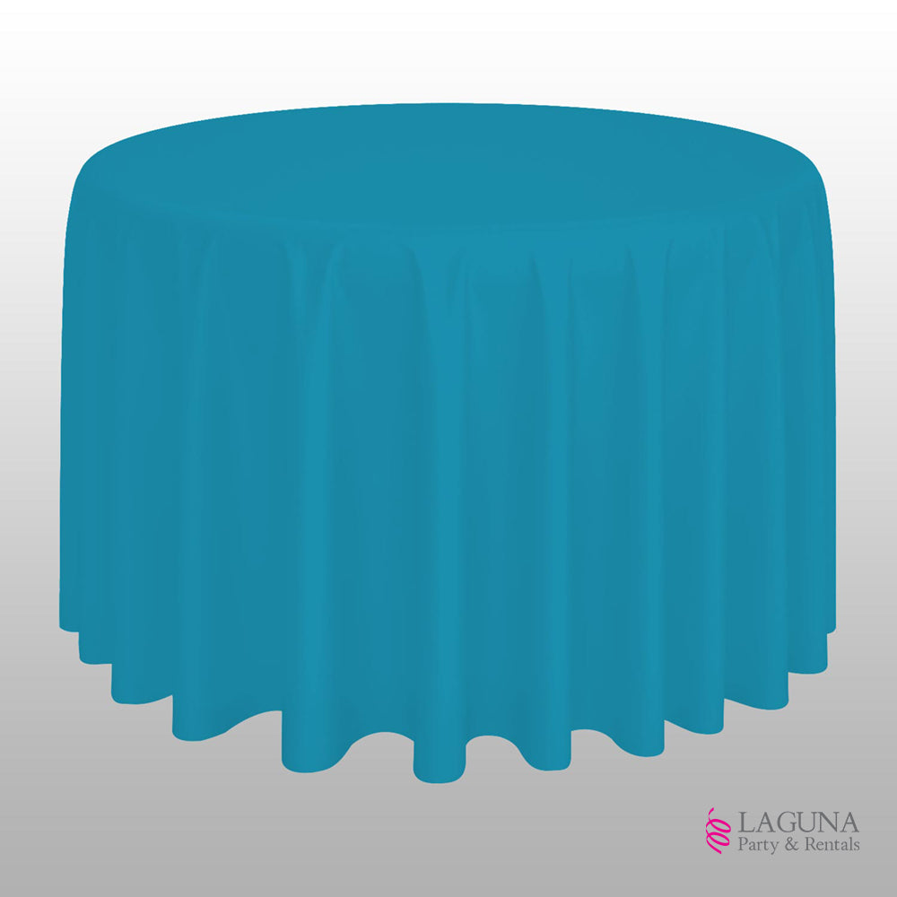 120″ Diameter • Turquoise Color • Polyester • Event setup guide • Linen sizing guide